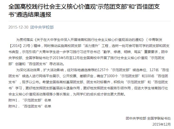 2015年5月至12月,为推动实施高校团支部“活力提升”工程,选树一批可亲可敬可学的团支部和团支书典型,示范引领广大青年学生进一步学习践行习近平总书记“勤学、修德、明辨、笃实”重要要求,团中央学校部、全国学联秘书处在全国高校中开展了践行社会主义核心价值观“示范团支部”创建活动。通过对各地推荐的1257个“示范团支部”进行遴选、展示、公开投票、差额评定、审核,大乐透 贸经1302班团支部被授予国家级“示范团支部”荣誉...