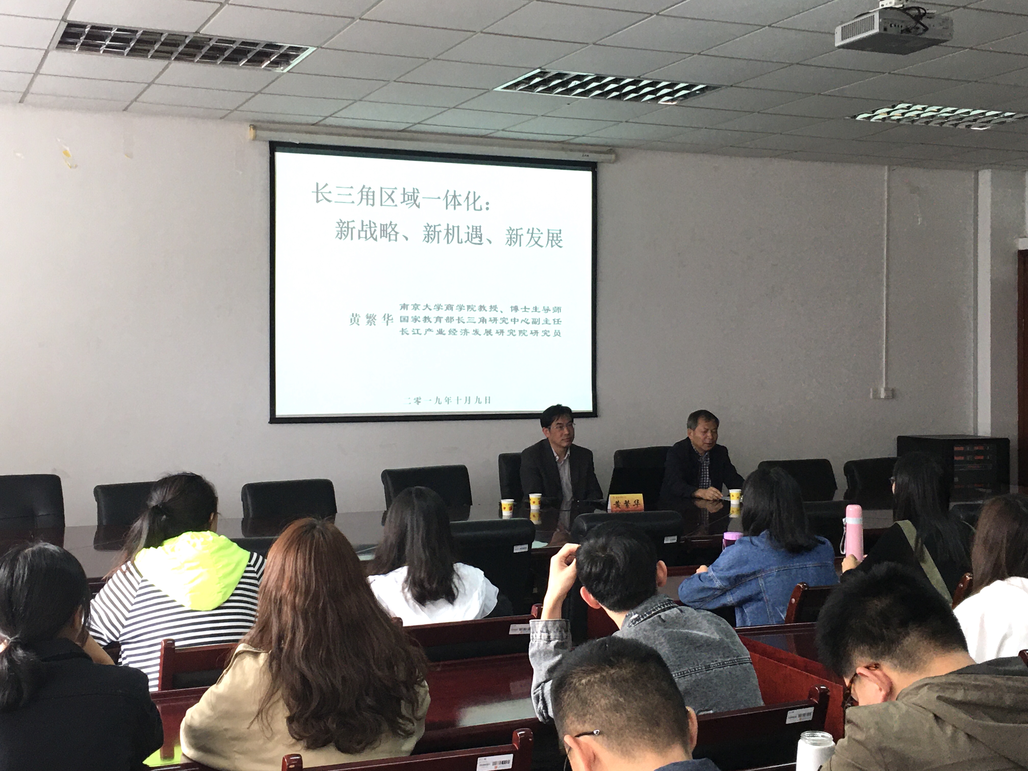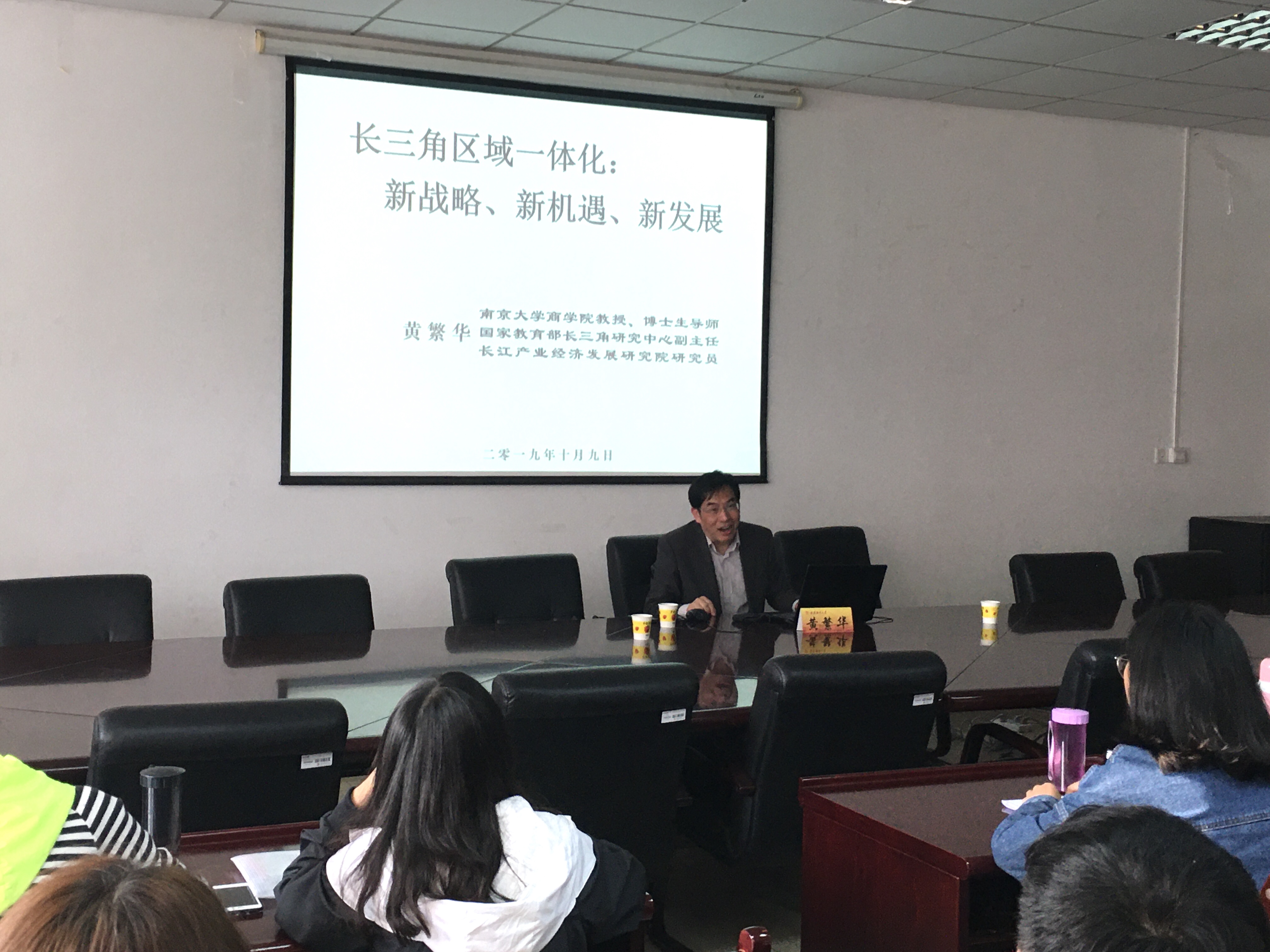 研究生了解长三角一体化战略的现实意义,积极投身于长三角这块全世界瞩目的热土建设,10月9日下午,南京大学商学院教授、博士生导师、教育部长三角研究中心副主任、长江产业经济发展研究院研究员黄繁华来到德经楼308会议室,为大乐透