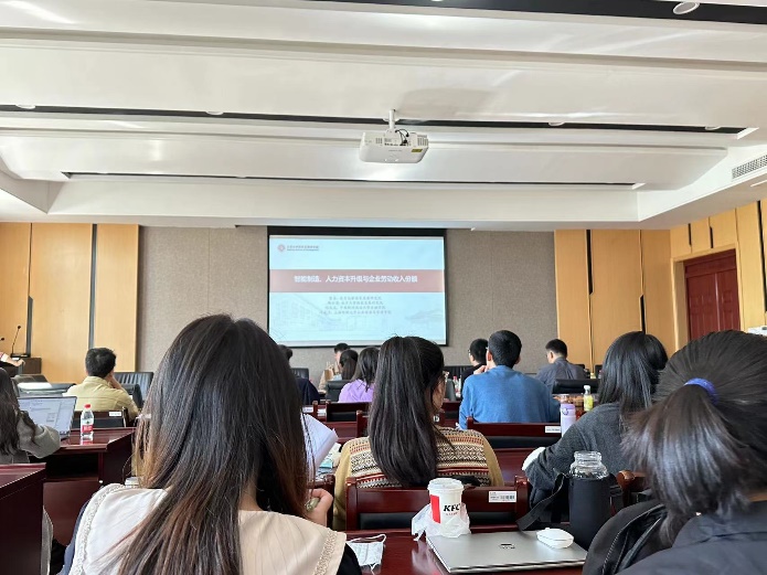 在文章中,陶云清博士将智能制造的实施视为一次准自然实验,利用工业和信息部发布的《工业和信息化部关于公布智能制造试点示范项目名单的通告》,采用交叠DID方法探究该次政策试点对企业产能利用率的影响及其作用机制。最后得出结论:智能制造能够通过促进企业人力资本升级进而提升其劳动收入份额;智能制造对企业劳动收入份额的提升作用在劳动密集型企业、法制水平比较完整以及劳动力错配成都较低地区的企业中更为明显;并且通过进一步的研究发现,相比于协同型智能制造模式,生产型智能制造模式对企业劳动收入份额的提升作用更强.汇报完毕后,现场进行激烈的探究与讨论。我校王书斌老师、张少辉老师进行点评并给出宝贵的意见。