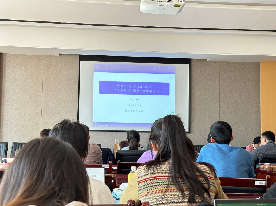 第二位演讲人是上海对外经贸大学的陈肯博士,他的汇报题目是《中国企业创新的成本效应——“坐享其成”还是“奋发图强”?》文章指出,中国的百年增长存在两种并行不悖的观点:创造性破坏理论和破坏性创新,在该理论的背景下,陈肯博士对成本冲击的双、多边效应进行分析,发现未受到TPU冲击的企业,其本身行业TPU较低,负担风险较小,所以在面临成本下降的时候,会加紧购买中间品同时进行学习创新。根据实证结果分析,在面临高TPU的情况下,尽管成本降低,但由于企业依旧需要负担一定的不确定性风险,所以会更加倾向于选择“坐享其成”。并且文章将与高校的合作纳入模型之后,发现企业的自主研发的创新性会进一步显著。在汇报完毕后,我校的叶迪老师和刘凯丰老师给出了宝贵的建议。