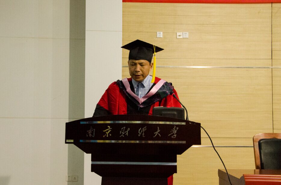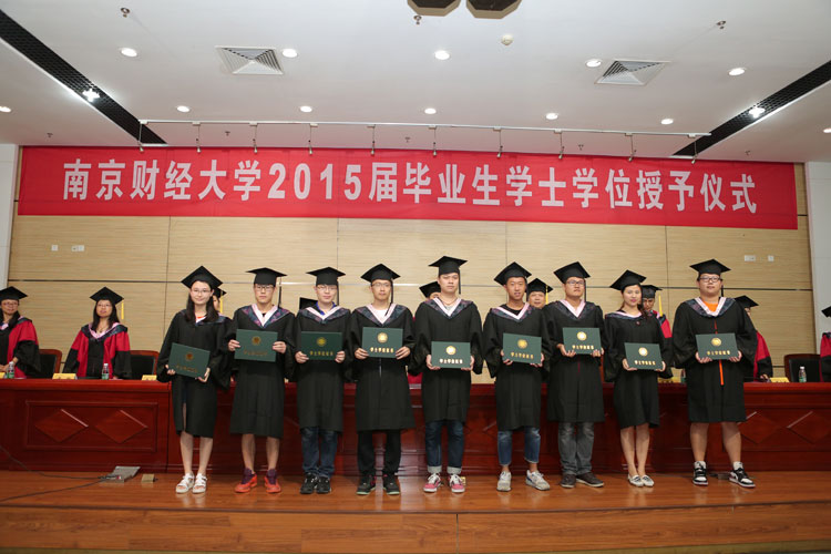 2015届全体毕业生颁发学士学位证书。每一位毕业生身着黑色学士服,带着专属青春的自信笑容,庄重地从导师们手中接过学位证书,导师们为同学们将流苏从右边拨到左边,预示了人生崭新征程的发端。接着,学士学位获得者代表贸经1101班王雯斌发言,她回味了1461个日夜的酸甜苦辣,分享了四年南财生活的喜怒哀乐,代表毕业生向陪伴了他们四年的老师表示了衷心的感谢,并承诺将铭记母校教诲,祝愿母校的明天更加美好更加灿烂。