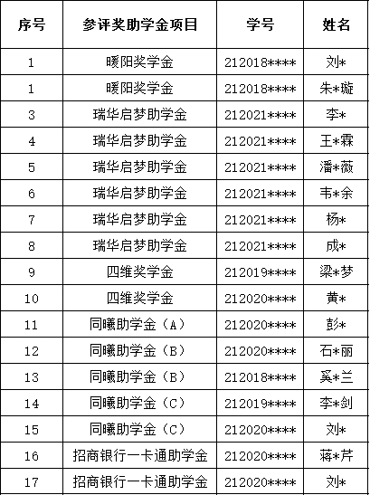 根据《大乐透 本科学生奖(助)学金管理条例》(南财大学字〔2017〕11号)和大乐透 教育发展基金会、学生处《关于做好我校2021年度本科生“社会奖助学金”评选工作的通知》,由学生本人申请,经学院评审,本次拟推荐名单公示如下: