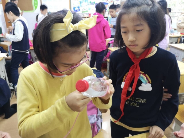 在志愿者唐奕教授时,一个小男生尝试多次在塑料瓶身上缠绕毛线,但都滑落了,唐奕耐心的分解步骤,一圈一圈地演示。后来志愿者唐奕表示:“面对一群朝气蓬勃的四年级的学生,教一次两次不会是很正常的。我希望他们能够在趣味性的手工制作过程中,找到变废为宝的乐趣,同时基本了解爱物节用的精神,教学过程也让我很有成就感!”