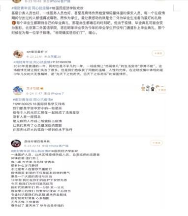 在这次活动中,同学们以文字传递人间真情,鼓舞士气,记录防控疫情中邻里互助的真情瞬间。王佳宁同学表达“疫情无情人有情,愿数字清零,疫情早日结束”的愿望。彭玲同学以“哪有什么岁月静好,不过是有人替你负重前行”传递出对抗疫工作人员的尊敬。陈欢欢同学分享了暖心的毕业典礼。还有很多的博文,欢迎同学们进入微博话题浏览。