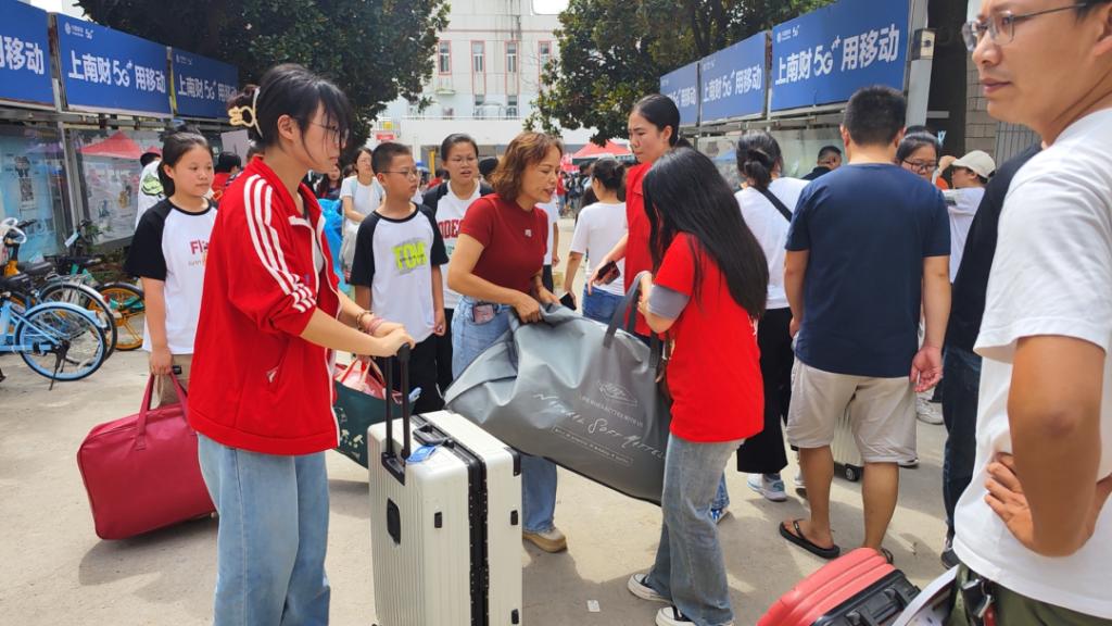 的志愿者们便穿着统一的服装,热情地迎接着入学的新生们。他们戴着笑容,手持标识牌,或站在各个报道点附近,引导新生们到指定的位置报到;或帮助新生们搬运行李,送至对应的宿管站;或在一楼大厅,帮助新生报到登记......国贸2303王振宇同学不禁感叹道:“这是我第一次离家,志愿者们的全力帮助让我感受到了大乐透