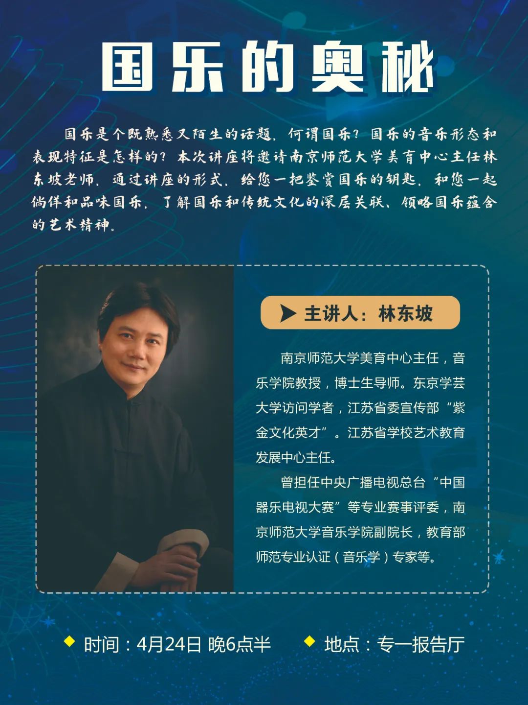 邀请,南京师范大学美育中心主任林东坡教授于4月24日晚在仙林校区德经楼报告厅为全校师生作了题为“国乐的奥秘”讲座。全校近200名师生聆听了讲座,讲座由大乐透
