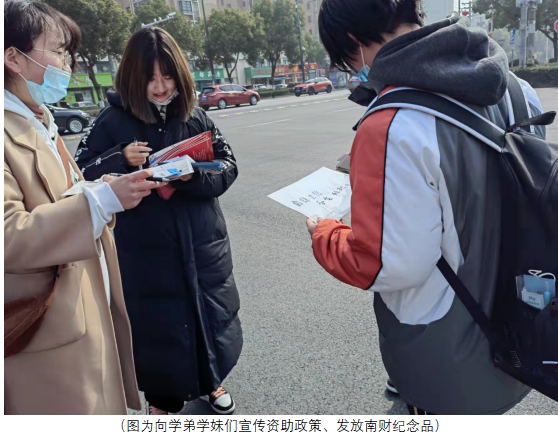 值得一提的是,在高邮中学宣讲时,特意设置了资助政策小问答的环节,在大家积极踊跃抢答中为答对的同学送出大使们精心准备的刻有学校logo的便利签和书袋,也是鼓励他们在大学能够继续奋斗。宣传大使们在中学门口摆“爱心小摊”,专门解答学弟学妹们对资助政策的疑问。除此之外,大使们还向学弟学妹分享了自己在南财一年以来的学习生活,包括校园环境、住宿情况、食堂美食等基本生活状况,不少学弟学妹们在听到如此充实美好的大学生活后眼里充满了对大学生活的憧憬。