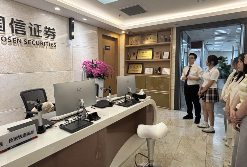 在公司负责人的引领下,学生们依次参观了国信证券的风控部、柜台、客服部及业务部等多个核心部门。在风控部,负责人详细阐述了风险识别、评估与管控的全面流程与机制。学生们了解到,面对瞬息万变的金融市场,风控部门依托精准的数据分析与严密的策略规划,有效抵御潜在金融风险,确保公司业务稳健前行。