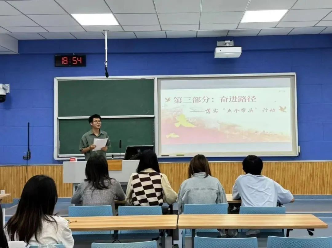 国贸23级研究生团支部的谢文杰同学围绕“爱国三问”,从三方面开展团课:一是叩问历史,讲述抗战时期青年以热血诠释“爱国三问”,且新时代“爱国三问”有了新内涵;二是立足当下,强调青年要怀爱国之心、立报国之志、增强国之能,并列举相关事例;三是展望未来,指出青年在推进中国式现代化中要以创新突破、全球视野、奋斗精神跑好青春接力。最后,她总结“爱国三问”的意义,呼吁青年以行动作答,为民族复兴努力。