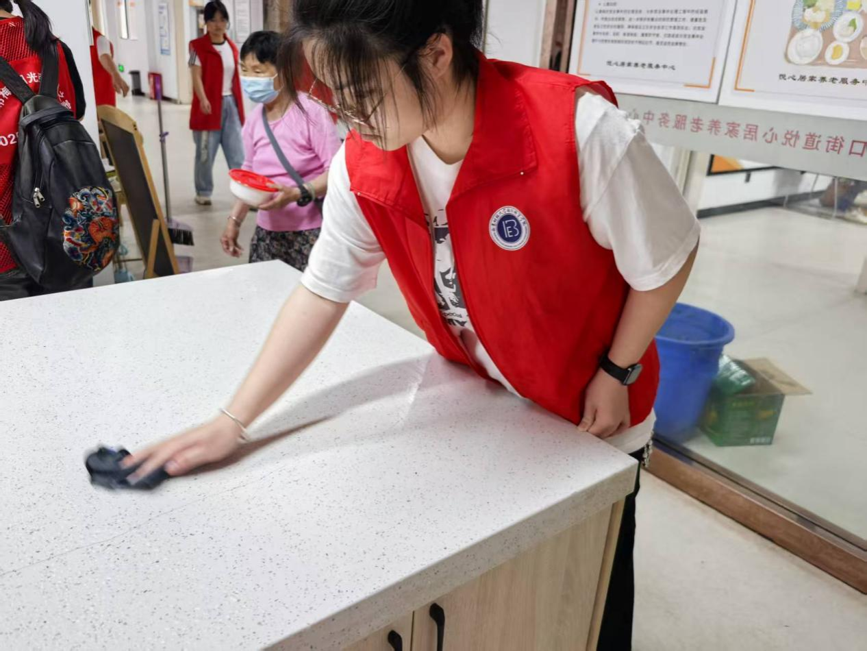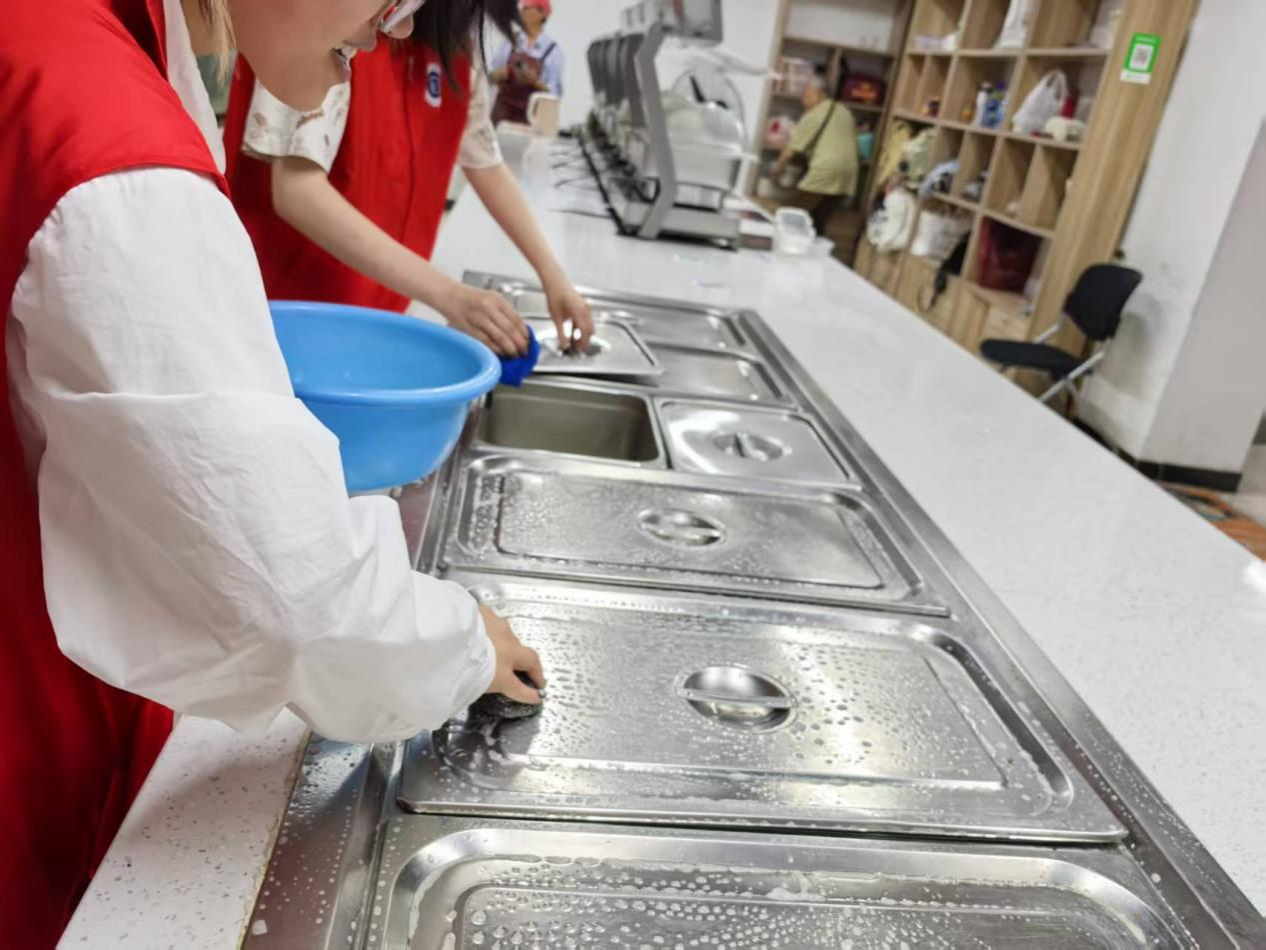 志愿队的成员先是依据服务中心工作人员的引导,对食堂进行了一次彻底的清扫行动。搬桌椅,拖地面,擦桌子,洗餐盘......为了给老人们提供舒心、放心的优质服务,志愿队的每名队员都铆足了干劲,有条不紊地推进清扫行动的落实,让整个食堂焕然一新。