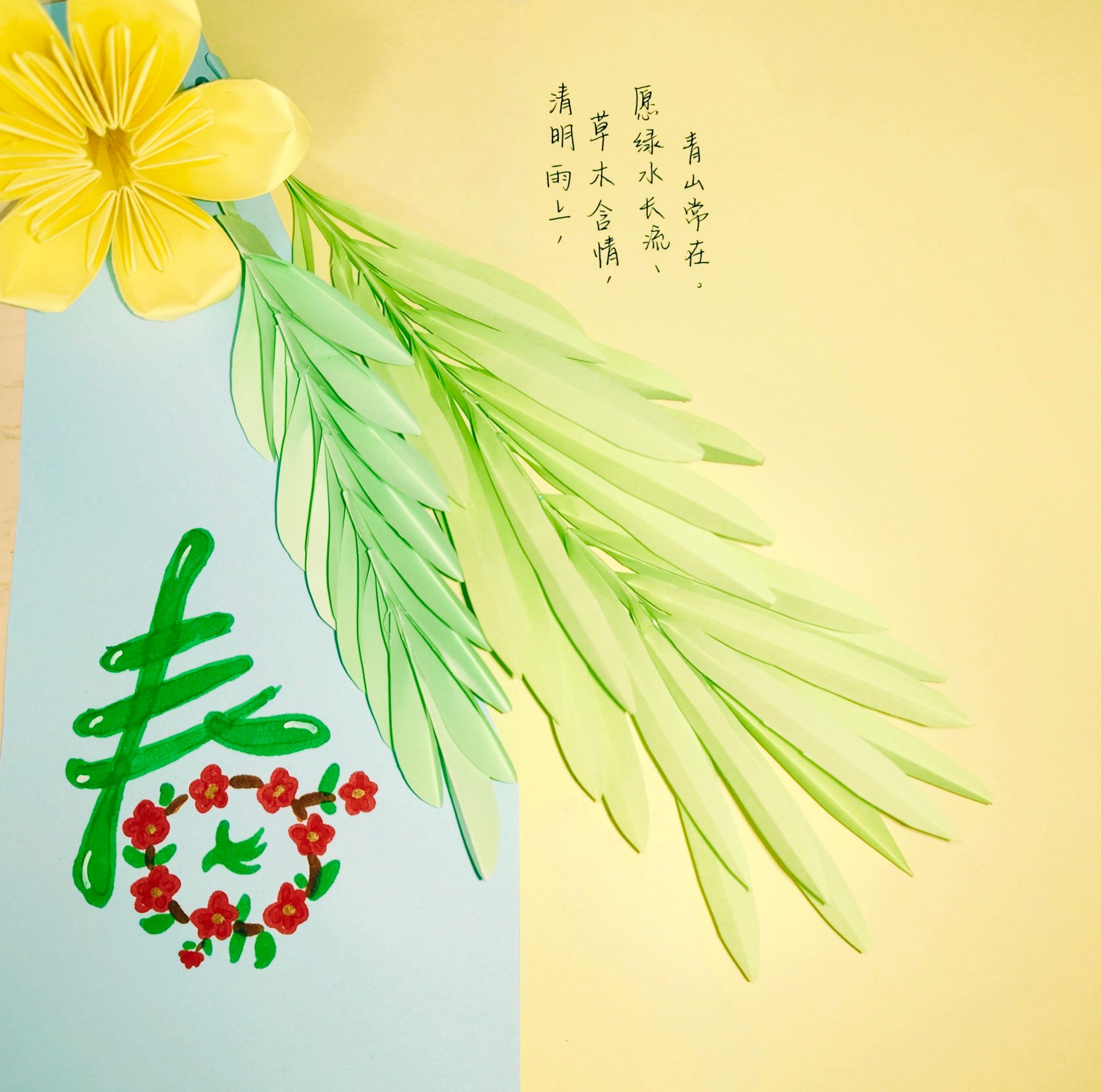 活动期间,学院同步开展 “折柳寄思” 手工体验活动。折柳作为清明最古老的习俗之一,古人以折柳相赠,既取 “留” 之谐音寄托不舍,也借柳枝顽强生命力传递美好祝福。为践行环保理念,志愿者们用绿色彩纸代替柳枝,精心折叠、描画、拼接,将心意融入指尖。大家在作品上写下真挚祈愿,或盼 “清明雨上,草木含情,愿绿水长流、青山常在”,或借樱花喻人,感慨 “樱花七日,绚烂至极而归于沉寂,恰如生命之短暂与珍贵”,字里行间既饱含青春朝气,更藏着对传统习俗的敬畏与对生命、自然的深切感悟。