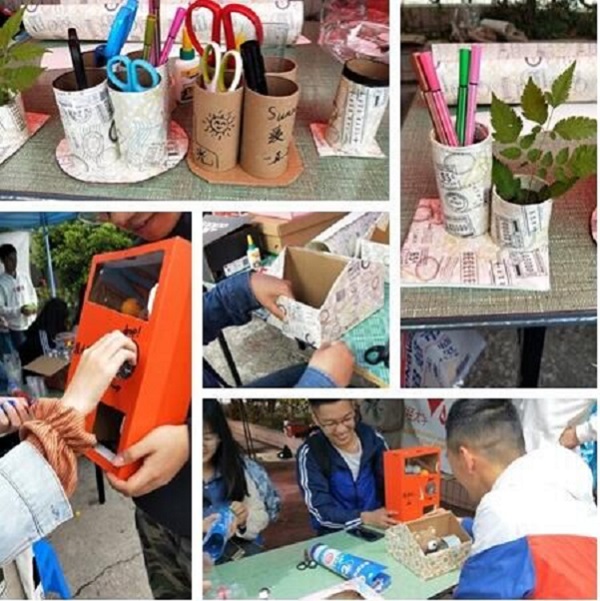 活动于4月22日正式展开线上线下活动宣传,通过SunnyQQ、微信等方式线上、线下宣传变废为宝DIY作品。活动当天,现场十分火热。过往的同学纷纷参与到活动中来,通过自己亲手制作,使平时生活中随手丢弃的废旧塑料瓶、鞋盒、易拉罐、快递盒等,摇身一变,成为一个个创意十足的作品,它们或是全自动化的售卖机,或是趣味性十足的空气弹弓,也有让人眼前一亮的创意花瓶。