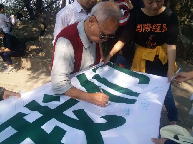 学生自发组成义工小分队来到紫金山,与登高的老人们聊健康、话家常,并通过一路捡起游客们随手丢弃的垃圾、“环保百人签名”、“为环保签字画押”“一句话视频”等倡议活动来宣传环保意识。登山的游客们主动在我们带去的倡议横幅上签名表示支持。一位年过8旬的爷爷签名时一直念叨:“这是好事!好事,我们一定得支持!”。十几位小朋友在父母的带领下也在横幅上“画”上自己的名字。很多游客在我们的镜头前,说出了自己“一句话”的环保倡议和承诺。参与活动的学生表示后期将剪辑制作成宣传视频,让更多人参与环保。