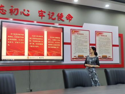 季书记首先向同学们展示了中国社会主义青年团第一次全国代表大会在广州东园召开的图片,由此引入今天的党课。季书记向党员们展示并讲述了习近平总书记在中国共产主义青年团成立100周年大会上的讲话,她阐述道:“时代各有不同,青春一脉相承,当代青年要在实现民族复兴的赛道上奋勇争先。”并以国贸院“漓漓原上草”的支教团队为例要求各位党员,“作为新时代新青年,当下最重要的是努力学习,要在美好的青春年华拼搏奋斗,绽放属于自己的光彩。”