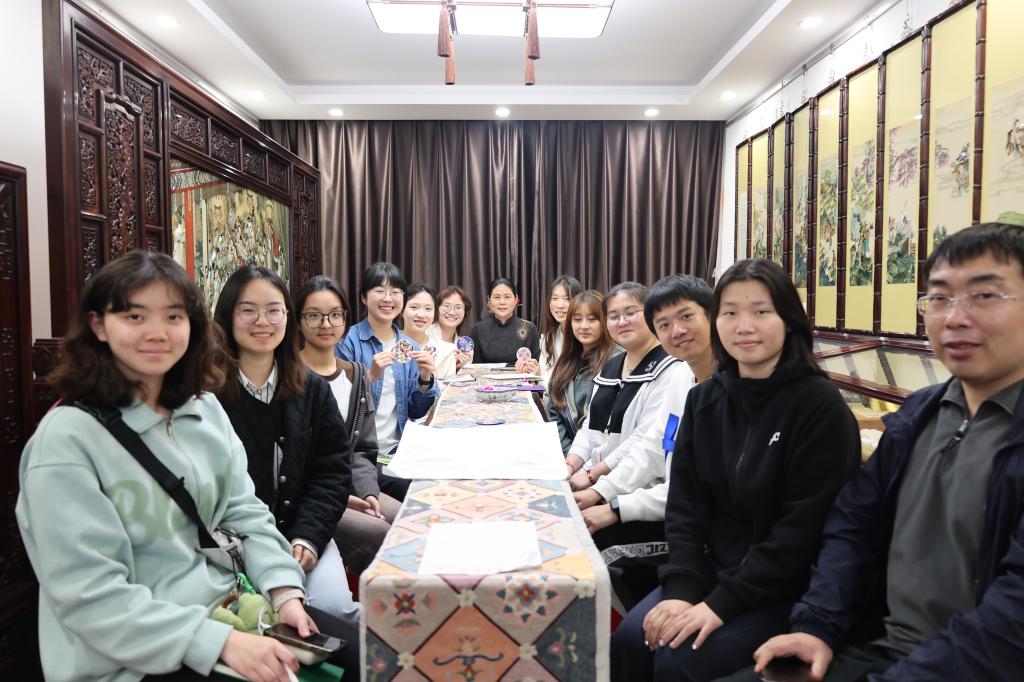下午,师生们又访谈了非遗大师卢建英。卢建英老师曾于2023年7月有幸参与接待习近平总书记的考察。在卢建英老师的工作室,卢老师用两个半小时的时间,与同学们分享了她的艺术人生和对苏绣的无限热爱。她的话语中流露出对传统技艺坚守的情感,以及对苏绣艺术的深刻见解,她的每一言一行都展现了对这门手艺的热爱和执着。这不仅让同学们感受到了非遗文化的厚重,更激发了他们对传统文化的兴趣与尊重。