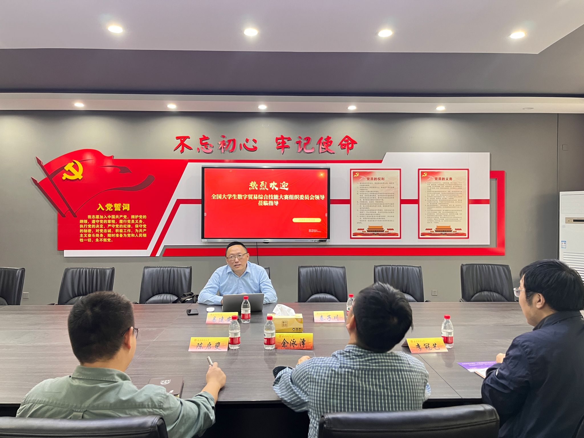 会上,院长余泳泽对组委会一行的到来表示热烈欢迎。双方分别就全国大学生数字贸易综合技能大赛的背景、未来前景及四大赛道的规则进行了详细交流。易建安首先对数字贸易大赛进行了详细介绍,通过参加全国大学生数字贸易综合技能大赛,学生可以提升实践能力,并有机会参加全球数字贸易博览会,了解数字贸易最前沿的发展,拓展视野。其次,对非洲国际化办学和数字贸易产业学院进行了阐述。