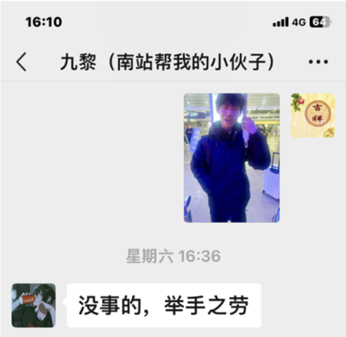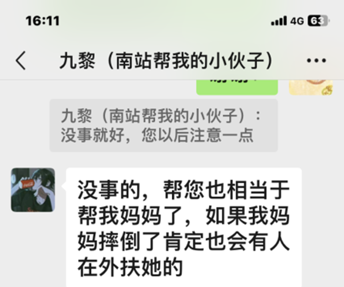 在出站检票口,他们两人终于加上了微信。当王女士表达要感谢时,小杨说,“没事的,帮您也相当于帮我妈妈了,如果我妈妈在外摔倒了肯定也会有人扶她的。”小杨朴实的话语让王女士十分感动。几经周转联系上学院后,王女士将锦旗与感谢函一并送了过来表达谢意。